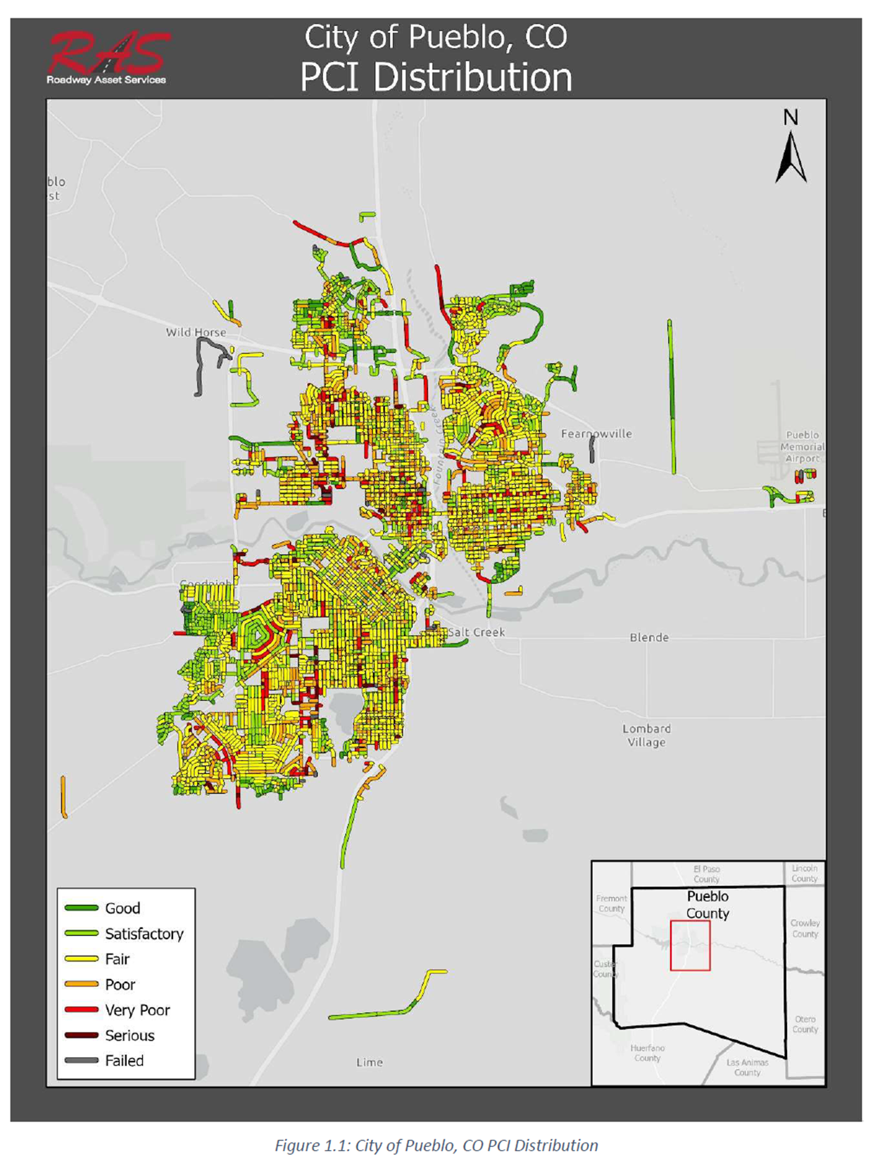 Roadway Asset Services, LLC (RAS) performed a pavement condition assessment for the City of Pueblo, CO to provide an accurate assessment of pavement conditions. The pavement data collection started on January 24, 2022 and completed on March 9, 2022.
